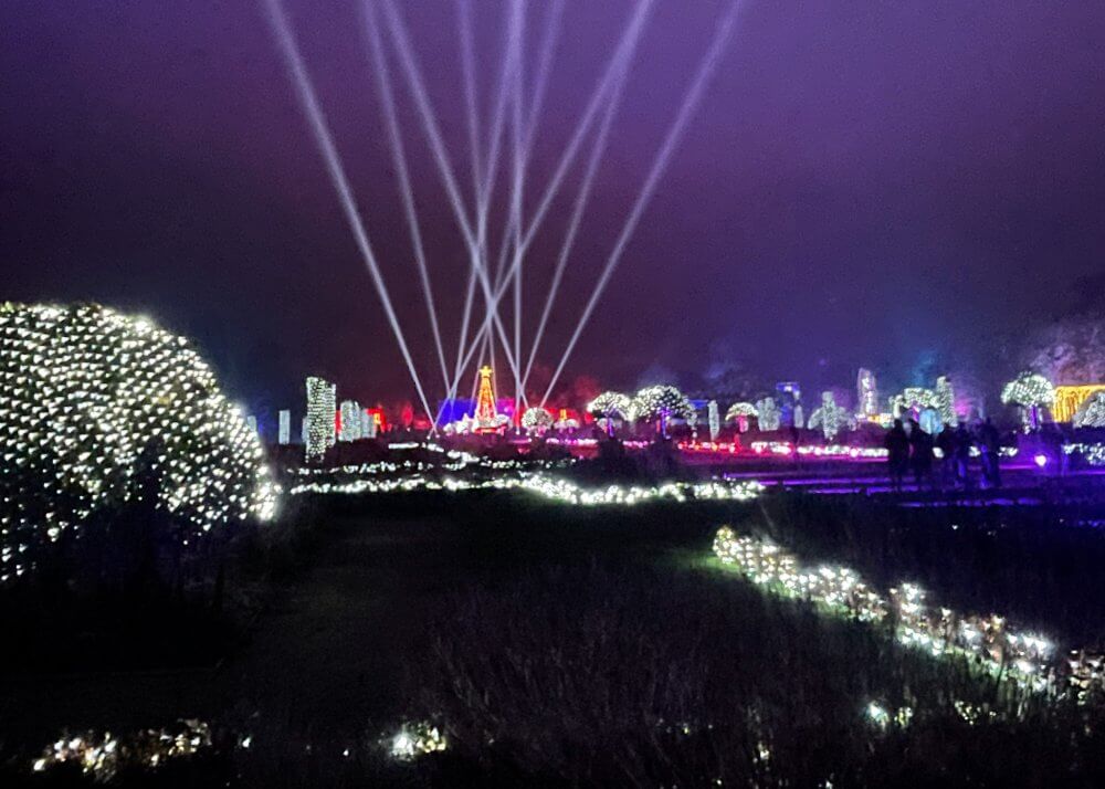 Christmas light trails are a festive walking route that illuminates a public space garden or park with thousands of twinkling light and music. We have attended local Christmas light trail for years including Trentham Gardens Winter Light Trail and Last Years Chatsworth House Christmas light trail and markets. We love the interactive displays, the Stunning twinkling light installations and the hot chocolate and toasted marshmallows at the end.
